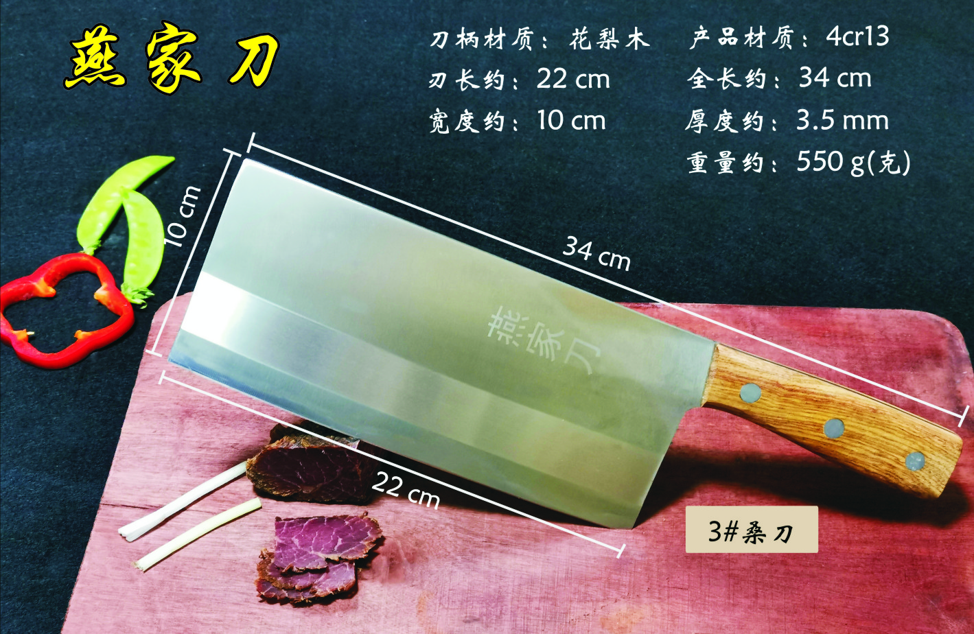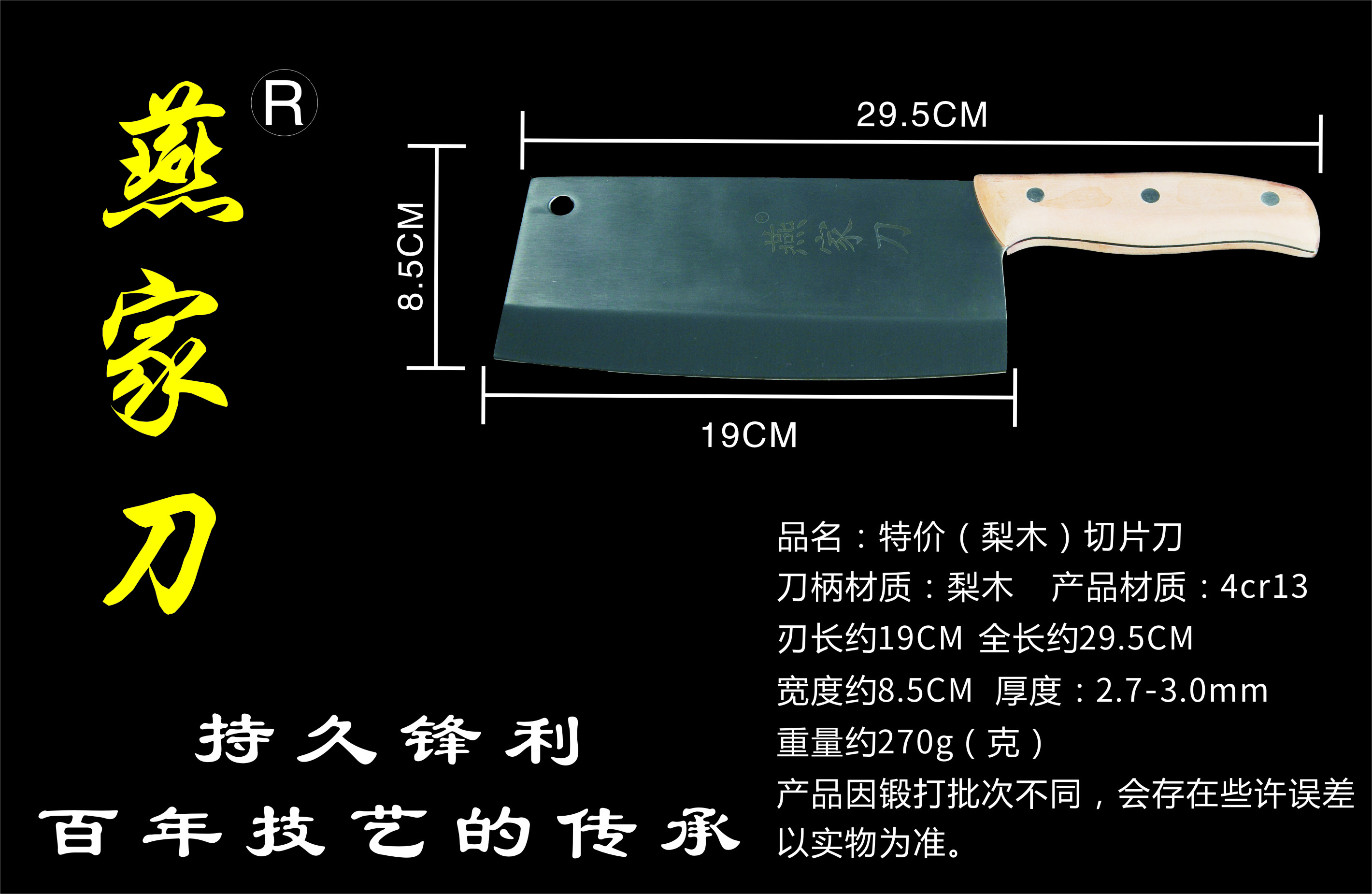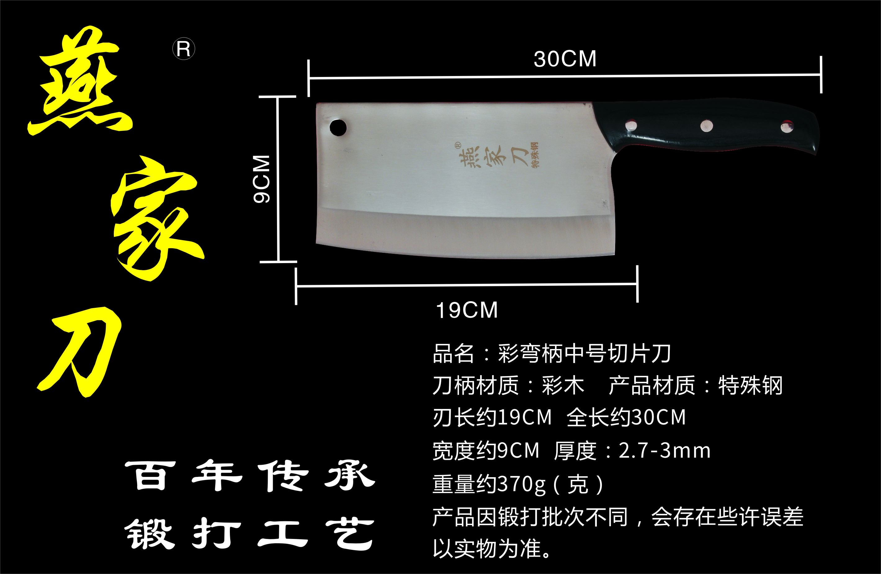 樂(lè)山燕家刀具有限公司(公司前身為燕佳鐵匠鋪),公司坐落于美麗的佛都之鄉(xiāng)樂(lè)山嘉州,在全國(guó)各地有上千家代理經(jīng)銷(xiāo)點(diǎn),公司專(zhuān)業(yè)銷(xiāo)售、設(shè)計(jì)、制作各類(lèi)刀具。秉承一貫鍛造三精要求,即選料精、用料精、工藝精。所選材料全部產(chǎn)自滇東鐵礦優(yōu)產(chǎn)區(qū)。本品牌刀具堅(jiān)持千挑萬(wàn)選為材,千錘百煉為刀的手工鍛造工藝宗旨。具有鋒利耐磨、持久耐用,用料上乘,硬度高、韌度強(qiáng)的特點(diǎn)!